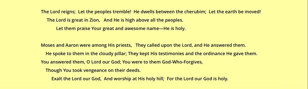 Praise The Lord -Psalm 99 Psalm 99 Share this: Click to share on X (Opens in new window) X More Click to share on Facebook (Opens in new window) Facebook Like Loading... Related