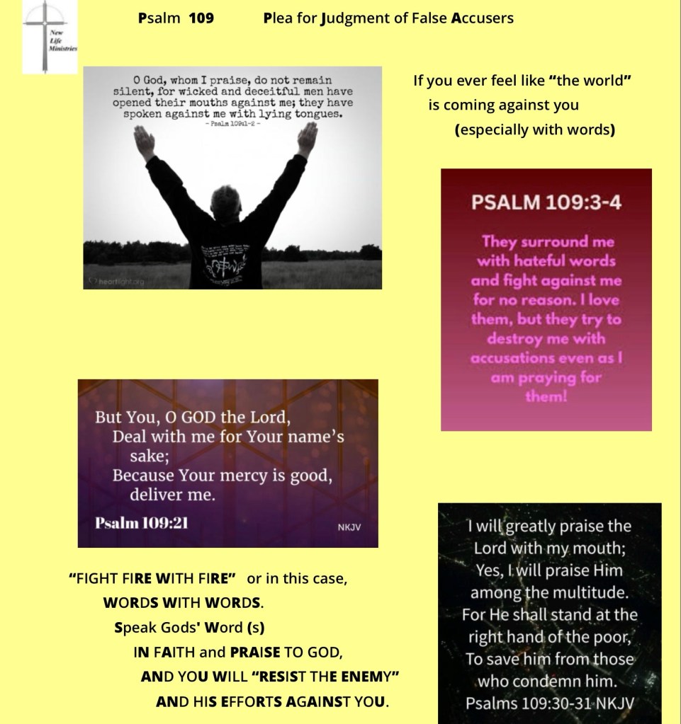 A Plea For Judgment Of False Accusers -Psalm 109 Psalm 109 Share this: Click to share on X (Opens in new window) X More Click to share on Facebook (Opens in new window) Facebook Like Loading... Related