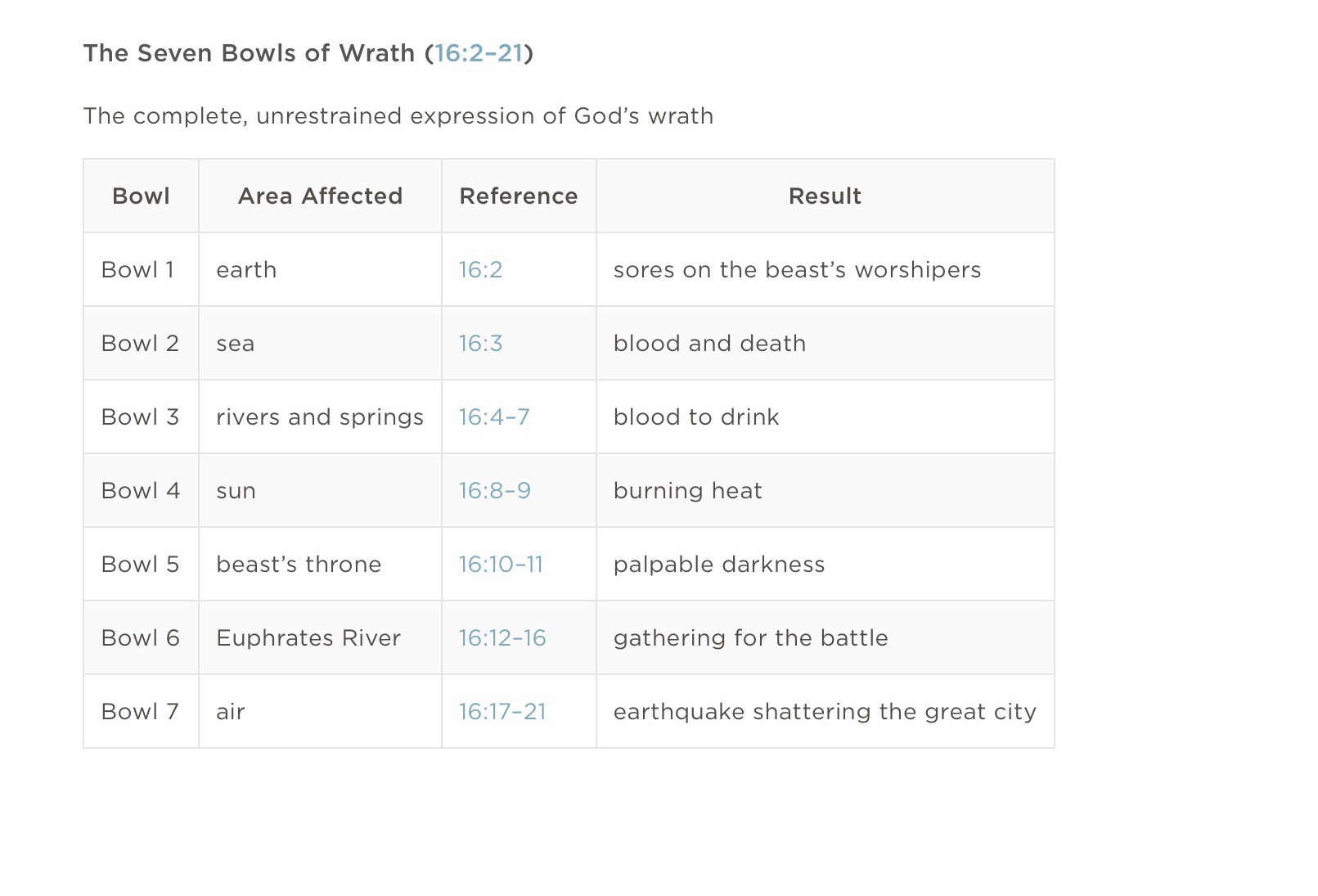 The examination of the bowls makes us note that each on represents the destruction of something God made in Genesis 1-2 for life and joy of His image bearers. It is noteworthy that they correspond to one of the 10 plagues of the Exodus on Egypt.