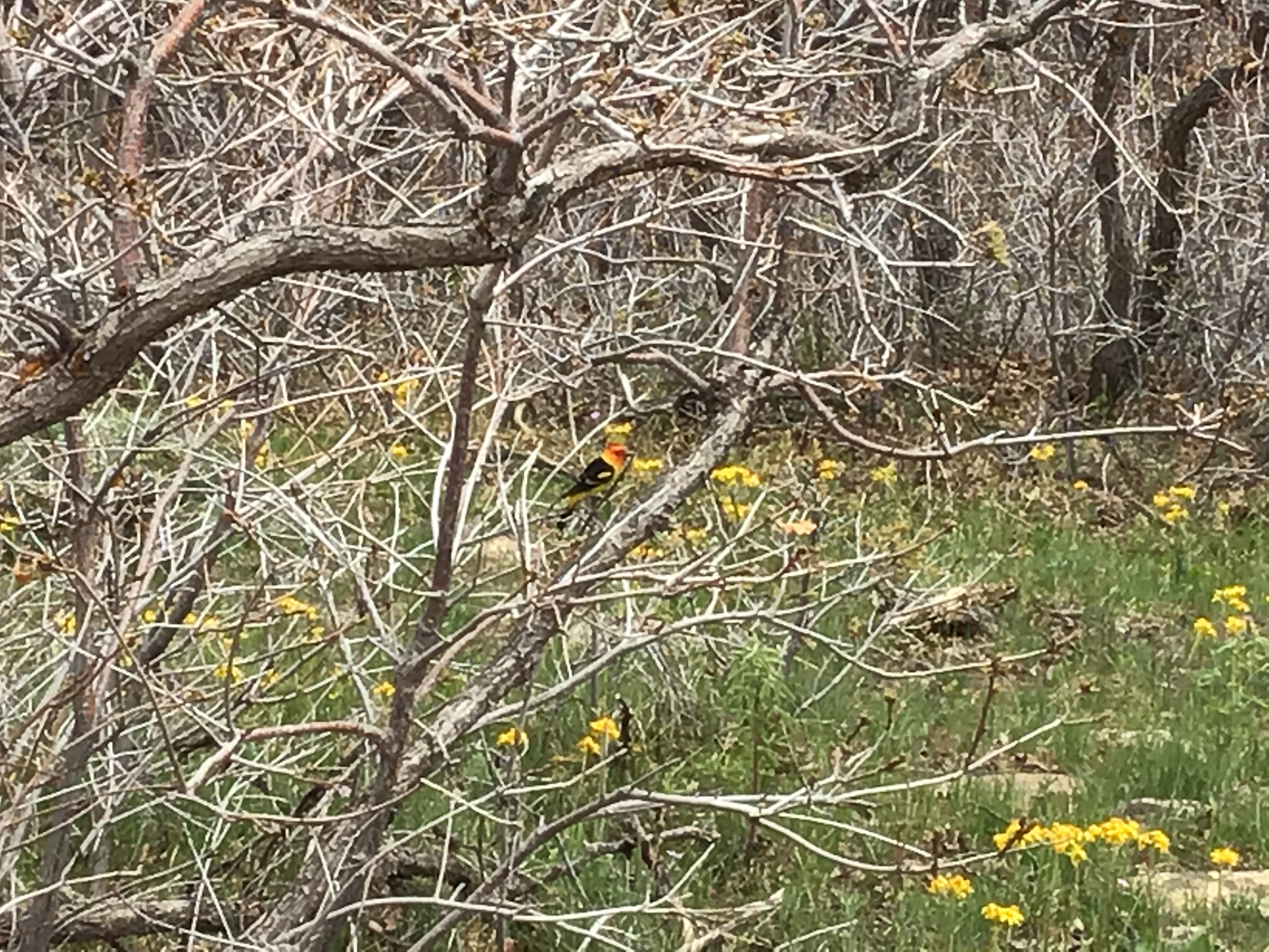 A clear look at a western tanager is like looking at a small flame- an orange head a brilliant yellow body, and coal black wings and tail.